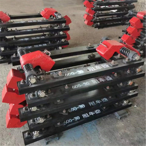 氣動阻車器由左、右輪擋部件、機座、氣控裝置等組成。輪擋關閉時阻擋礦車輪進行阻車,具有緩沖作用。輪擋打開時礦車可通過阻車器,輪擋的關閉和打開由氣控裝置控制,搬動氣控裝置的氣控閥,氣缸推動阻車輪擋打開,當?shù)V車通過后,反向搬動氣控閥,氣缸推動阻車輪擋關閉。