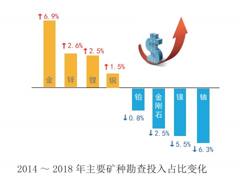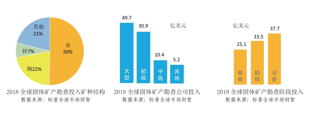 全球固體礦產(chǎn)勘查投入主要集中在金、銅和鋅等礦種,2018年勘查投入占比分別為50%、22%和7%。大型礦業(yè)公司是勘查市場(chǎng)主力軍,草根勘查投入低于后期成熟階段的勘查投入。