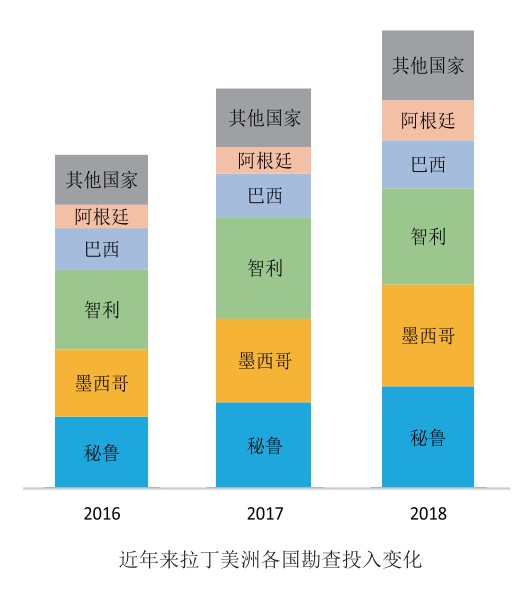 近3年,秘魯和巴西的勘查投入占比持續(xù)上升,2018年,秘魯?shù)拇笮豌~礦項(xiàng)目和巴西具有競(jìng)爭(zhēng)力的鐵礦石項(xiàng)目已經(jīng)成為拉美礦業(yè)投資的主要驅(qū)動(dòng)力。