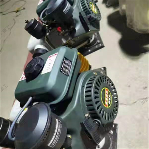 按二沖程內(nèi)燃機原理制成,汽缸內(nèi)有上、下兩個活塞,上活塞是內(nèi)燃活塞,下活塞是緩沖活塞。汽缸下部套裝有傾斜底面的夯錘,使汽缸豎向軸線朝前偏斜。上活塞桿從汽缸頂蓋中間的通孔伸出,下活塞桿從汽缸下端面伸出,并與夯錘聯(lián)成一體,汽缸與夯錘之間以彈簧拉緊,并設(shè)有扶手以控制夯土機的前進方向?;鹆辉诳扇蓟旌蠚獾娜急ψ饔孟?因此,朝前上方躍離地面,并在自重作用下,墜落地面夯擊土壤,夯錘一躍一墜,機身就步步前移。