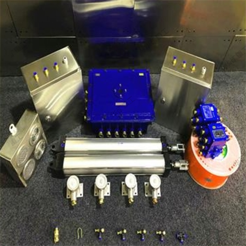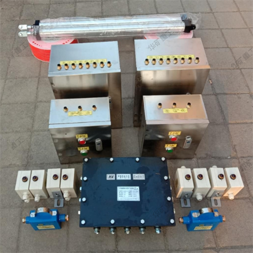 本裝置由1臺ZMK127-Z礦用風(fēng)門電控裝置主機、4臺FHF10礦用本安型紅外發(fā)送器、4臺FHS10礦用本安型紅外接收器、2臺GFK60礦用風(fēng)門開閉狀態(tài)傳感器、2臺KXB127礦用隔爆兼本安型語言報警器和2臺DFB-8-DH-1.0礦用隔爆型電磁閥組成。