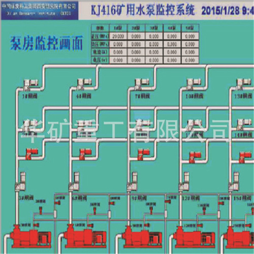 KJ416礦用水泵監(jiān)控系統(tǒng)是一套可對礦井水泵抽排水進(jìn)行集中監(jiān)控并能實(shí)現(xiàn)遠(yuǎn)程實(shí)時(shí)監(jiān)控的現(xiàn)代化控制系統(tǒng),該系統(tǒng)解決了現(xiàn)有礦井排水系統(tǒng)開泵程序繁瑣,發(fā)生透水事故時(shí)無人開啟備用水泵,系統(tǒng)故障以及排水效率低下等問題。本系統(tǒng)通過各種先進(jìn)可靠的傳感器、保護(hù)器、電動(dòng)閘(球)閥、監(jiān)控電視等監(jiān)測煤礦井下排水系統(tǒng)各設(shè)備的工作狀態(tài),實(shí)現(xiàn)井下水位、水壓、水泵排水系統(tǒng)的自動(dòng)監(jiān)控,及時(shí)發(fā)現(xiàn)系統(tǒng)存在的隱患與故障點(diǎn)。此外,將監(jiān)測到的數(shù)據(jù)實(shí)時(shí)通過光纖上傳至地面上位系統(tǒng)可方便實(shí)現(xiàn)井下泵房遠(yuǎn)程控制。該系統(tǒng)與KJ117礦井水文監(jiān)測系統(tǒng)的聯(lián)動(dòng),可以實(shí)時(shí)監(jiān)控礦井上下水文觀測孔水壓、水溫、流量以及采空區(qū)水位,排水明渠等水文參數(shù),通過多種傳感器的實(shí)時(shí)監(jiān)測可實(shí)現(xiàn)對煤礦透水事故的預(yù)警,事故通過井下光纜將數(shù)據(jù)傳輸至生產(chǎn)調(diào)度中心監(jiān)控平臺(tái),系統(tǒng)預(yù)留井下通訊接口,并以指揮井下人員在發(fā)生透水事故時(shí)的緊急撤離,為及時(shí)啟動(dòng)礦井水災(zāi)應(yīng)急救援和最大限度地保證煤礦安全生產(chǎn)提供可靠技術(shù)手段。