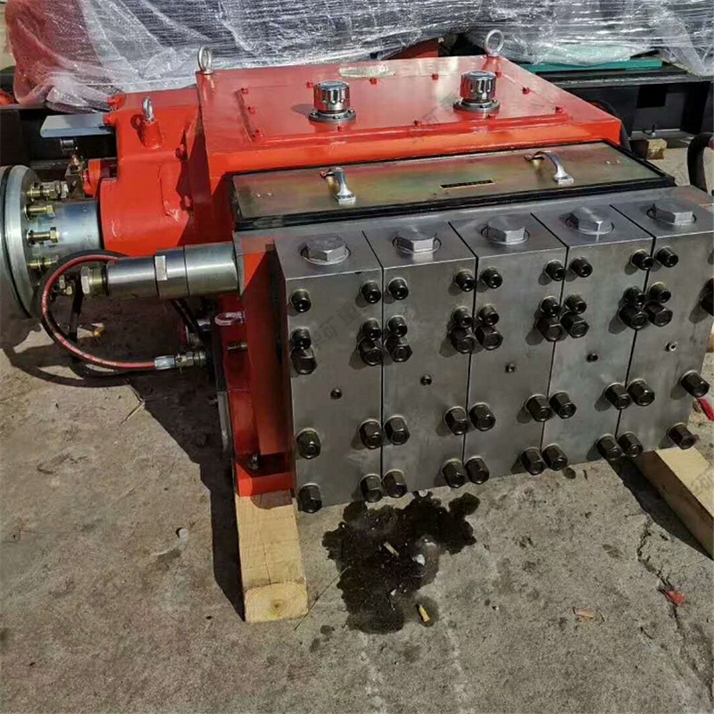 乳化液泵主要由曲軸箱、高壓鋼套、泵頭等組件組成。泵的液力端采用分立的泵頭組成,泵頭下部安裝吸液閥,上部安裝排液閥,排液腔由一個(gè)高壓集液塊與五個(gè)分立的泵頭高壓出口相連,高壓集液塊一側(cè)裝有安全閥,另一側(cè)裝有卸載閥。曲軸箱設(shè)有冷卻潤滑系統(tǒng),安裝在齒輪箱上的齒輪油泵經(jīng)箱體下方的網(wǎng)式濾油器吸油,排出壓力油經(jīng)過設(shè)在泵吸液腔的油冷卻器冷卻后到中空曲軸潤滑連桿大頭。