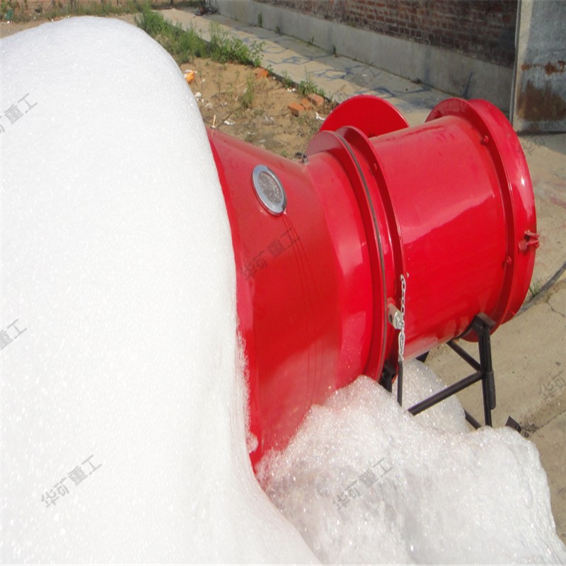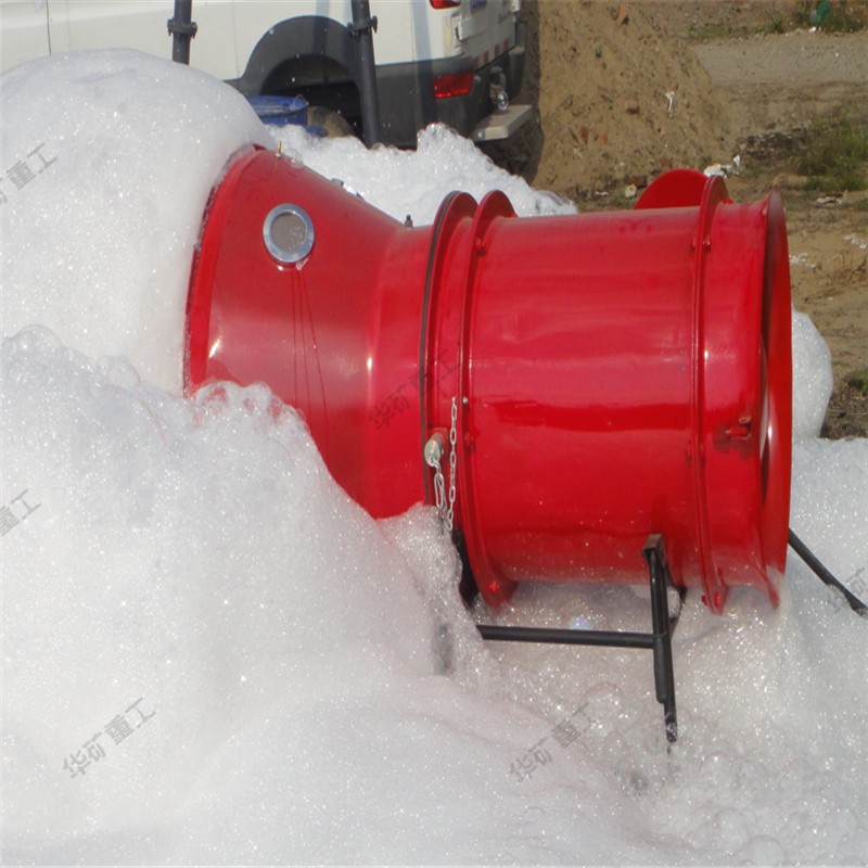 高倍數空氣泡沫具有滅火速度快、水漬損失小、成本低和無毒等優(yōu)點。實踐說明,高倍數泡沫滅火適用于撲滅煤礦井下巷道及地面,地下有限建筑空間。如煤炭、木材、油類火災。由于驅動風壓高,可以在巷道中遠距離火區(qū)的安全地點操作。高倍數泡沫能迅速覆蓋火源,切斷火場空氣的來源,隔斷輻射熱、熱對流、熱傳導的作用。高倍數泡沫在燃燒區(qū)汽化而吸收大量的汽化熱。能起隔熱、降溫作用,同時放出大量的水蒸氣,沖淡燃燒區(qū)含氧量,起著窒息的作用。