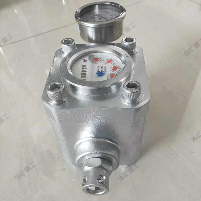高壓注水流量計安裝在注水系統(tǒng)管路中.水流入水表后,在濾罩沿葉輪盒下腔切線進入葉輪盒,推動葉輪旋轉;水在葉輪盒中旋轉上升進入葉輪盒上腔切線流出;葉輪旋轉經(jīng)其上面的永磁體帶動承壓板上面的中心輪轉動,中心輪帶動水量指示器中的計數(shù)機構記錄流經(jīng)水表的水量,煤層注水的壓力直接側壓孔,通過壓力指示器指示