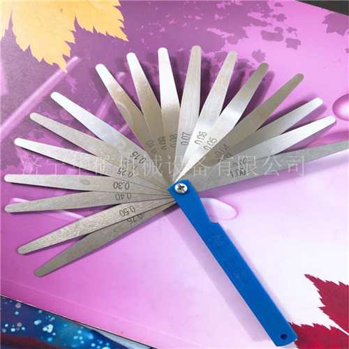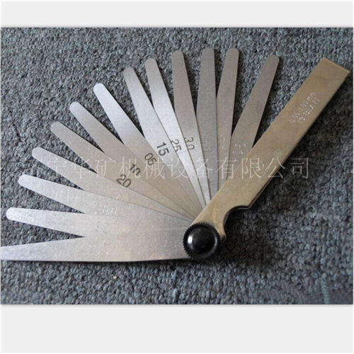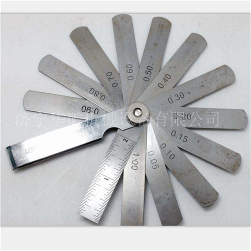 塞尺由一組具有不同厚度級差的薄鋼片組成的量規(guī)。塞尺用于測量間隙尺寸。在檢驗被測尺寸是否合格時,可以用通止法判斷,也可由檢驗者根據(jù)塞尺與被測表面配合的松緊程度來判斷。塞尺一般用不銹鋼制造,最薄的為0.02毫米;最厚的為3毫米。自0.02~0.1毫米間,各鋼片厚度級差為0.01毫米;自0.1~1毫 米間,各鋼片的厚度級差一般為0.05毫米;自1毫米以上,鋼片的厚度級差為1毫米。